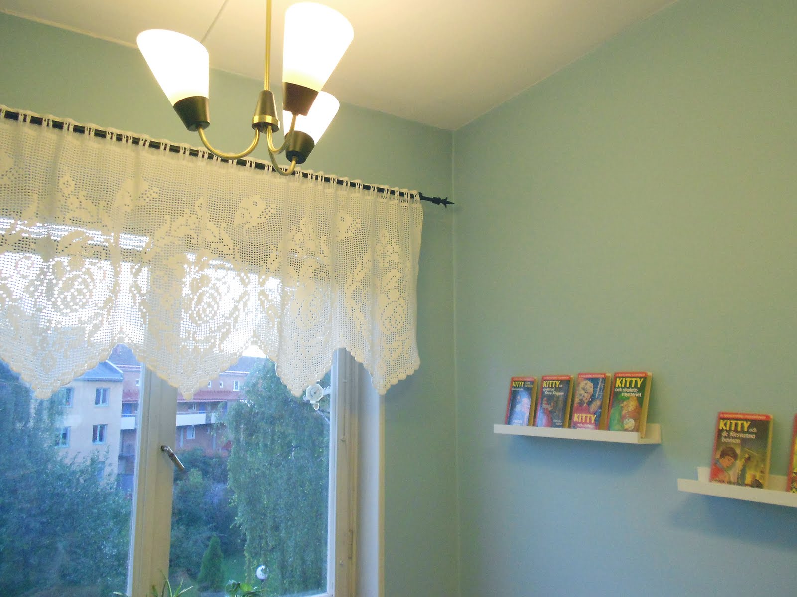 I onsdags var jag på Erikshjälpen med två kära vänner (kära för mig alltså, inte i varandra!) och letade efter mer eller mindre nödvändigheter. Och kan ni tro, i en korg skyltad "alla dukar 10 kr" hittade jag denna virkade gardinkappa. TIO KRONOR! Det fanns inget annat att göra än att punga fram guldpengen och sätta upp den i köket!